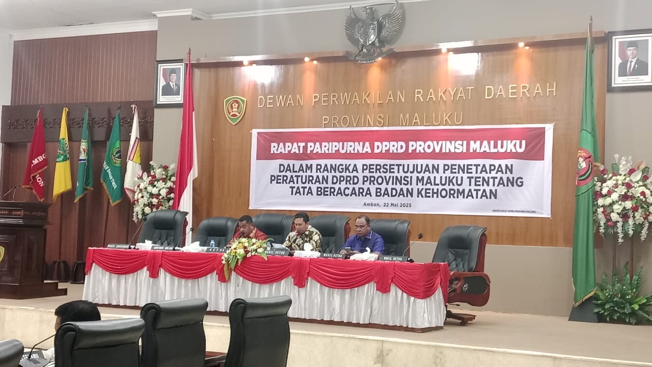 AMBON (info-ambon.com)-Dewan Perwakilan Rakyat Daerah (DPRD) Provinsi Maluku menggelar rapat paripurna dalam rangka persetujuan penetapan Peraturan Daerah (Perda) tentang Tata Beracara Badan Kehormatan (BK) DPRD.