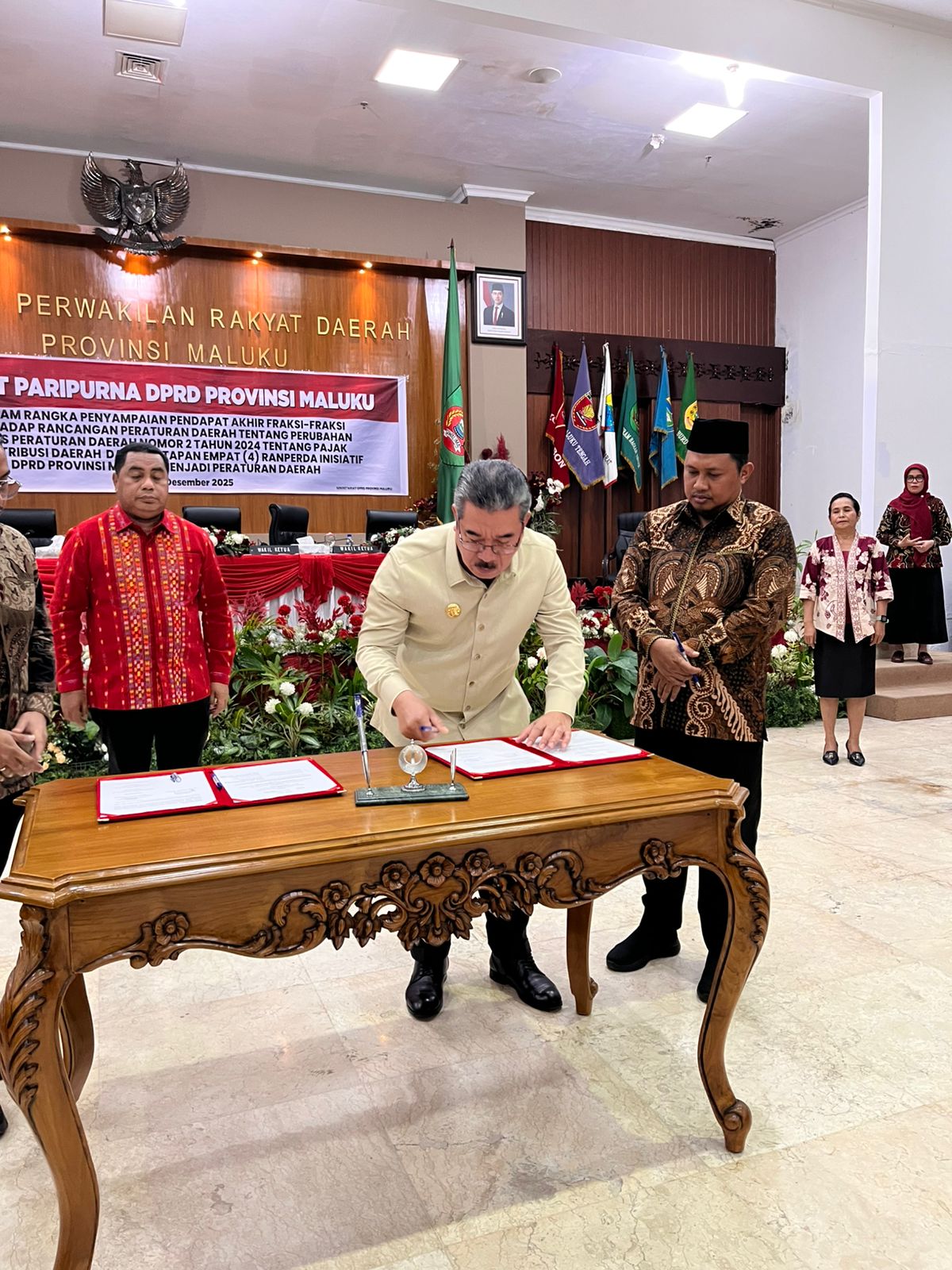 Rapat paripurna dipimpin langsung Ketua DPRD Provinsi Maluku, Benhur George Watubun, yang menegaskan bahwa penetapan regulasi daerah bukan sekadar formalitas, melainkan langkah politik dan hukum untuk memperkuat tata kelola pemerintahan serta menopang kemandirian fiskal daerah.