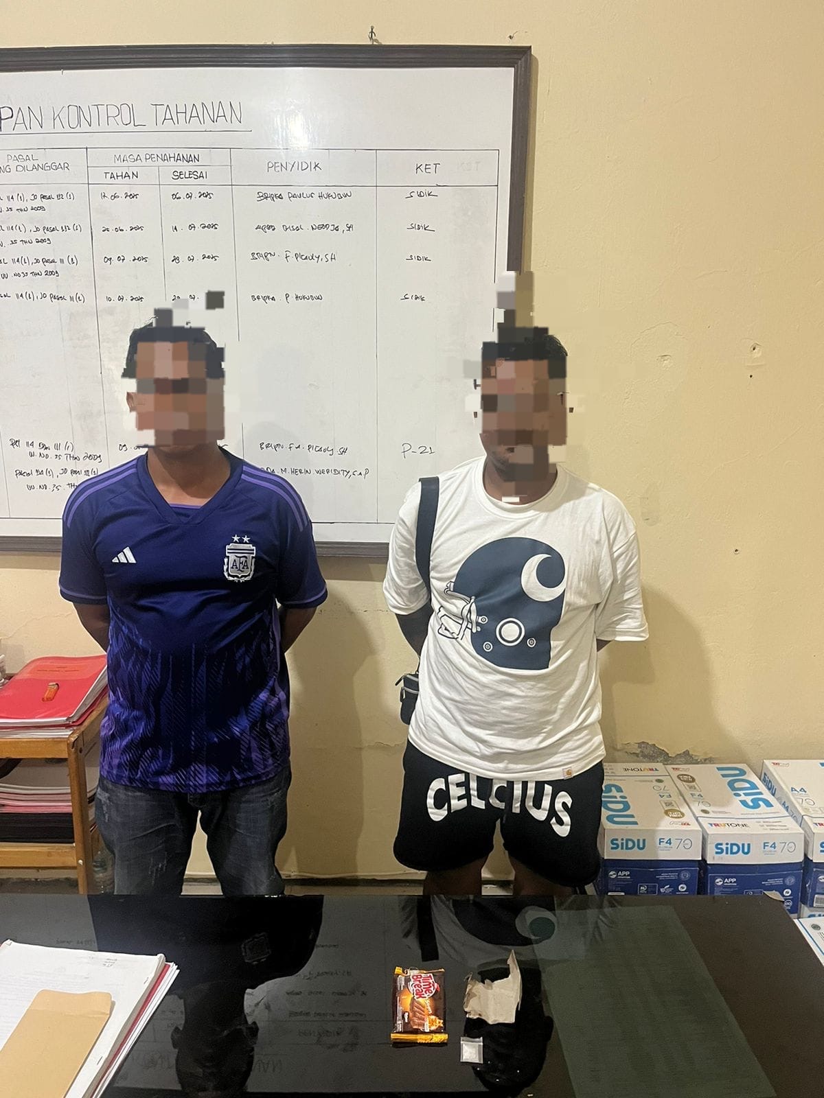 Saat penggeledahan, polisi menemukan satu paket kecil narkotika jenis sabu yang disimpan dalam plastik klip bening, dibungkus plastik camilan bermerek dan potongan kertas warna hitam. Barang bukti itu disembunyikan di dalam saku celana salah satu pelaku.