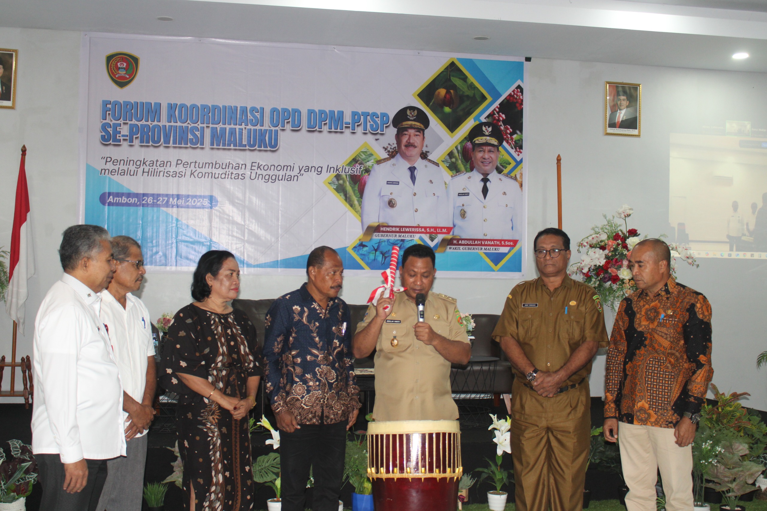 AMBON (info-ambon.com)- Forum Koordinasi OPD Dinas Penanaman Modal dan Pelayanan Terpadu Satu Pintu (DPM-PTSP) se-Provinsi Maluku, dengan tema “Peningkatan Pertumbuhan Ekonomi yang Inklusif melalui Hilirisasi Komuditas Unggulan” resmi dibuka oleh Wakil Gubernur Maluku H. Abdullah Vanath yang ditandai dengan pemukulan tifa, Senin (26/5/2025) di salah satu Hotel di Kota Ambon.