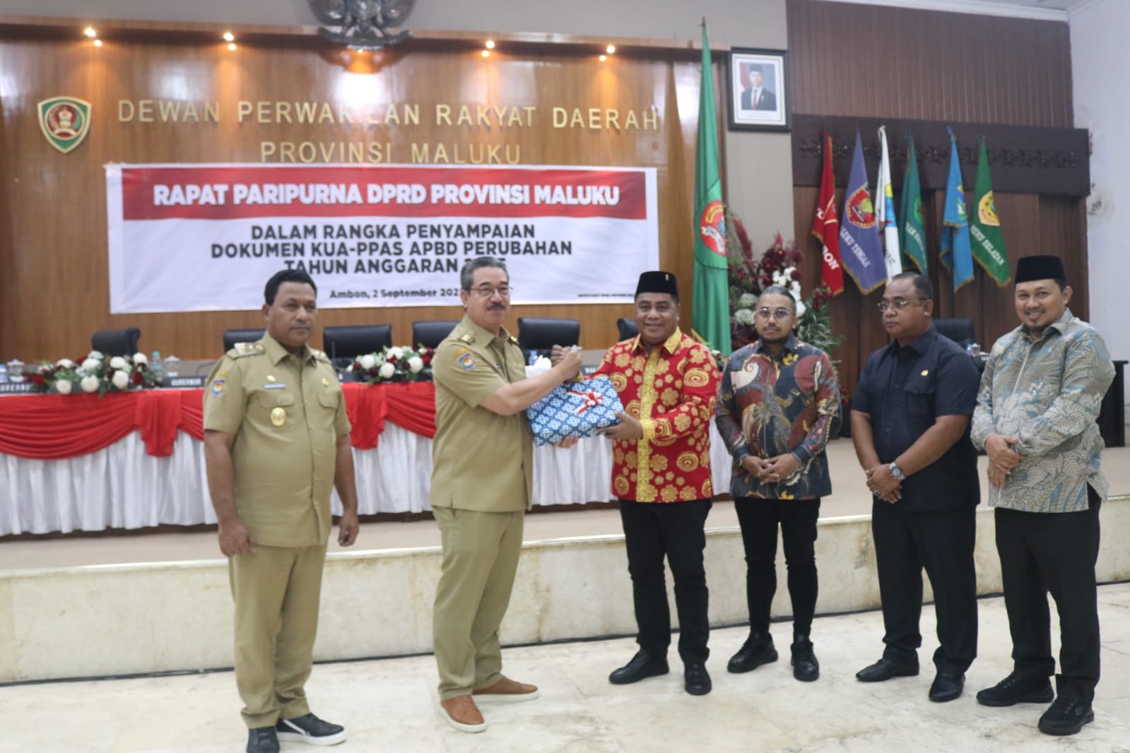 AMBON (info-ambon.com)-Gubernur Maluku Hendrik Lewerissa secara resmi menyerahkan dokumen Kebijakan Umum Anggaran serta Prioritas dan Plafon Anggaran Sementara (KUA-PPAS) Perubahan APBD Tahun Anggaran 2025 kepada Ketua DPRD Maluku, di Ruang Rapat Paripurna, Karang Panjang, Selasa, (2/9/2025).