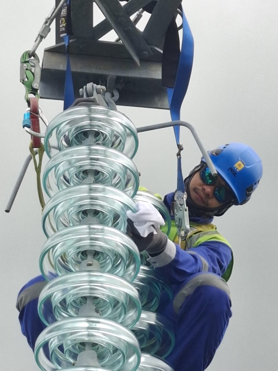 Pekerjaan lapangan dimulai dengan manuver pemutusan tegangan demi memastikan keselamatan kerja. Setelah memastikan tidak ada tegangan tersisa menggunakan voltage detector, tim melakukan grounding lokal di titik kerja. Pemeliharaan yang dilakukan meliputi pembersihan isolator dan penyesuaian arching horn menggunakan peralatan khusus, dengan pengawasan ketat untuk memastikan kepatuhan terhadap SOP dan standar konstruksi PLN.