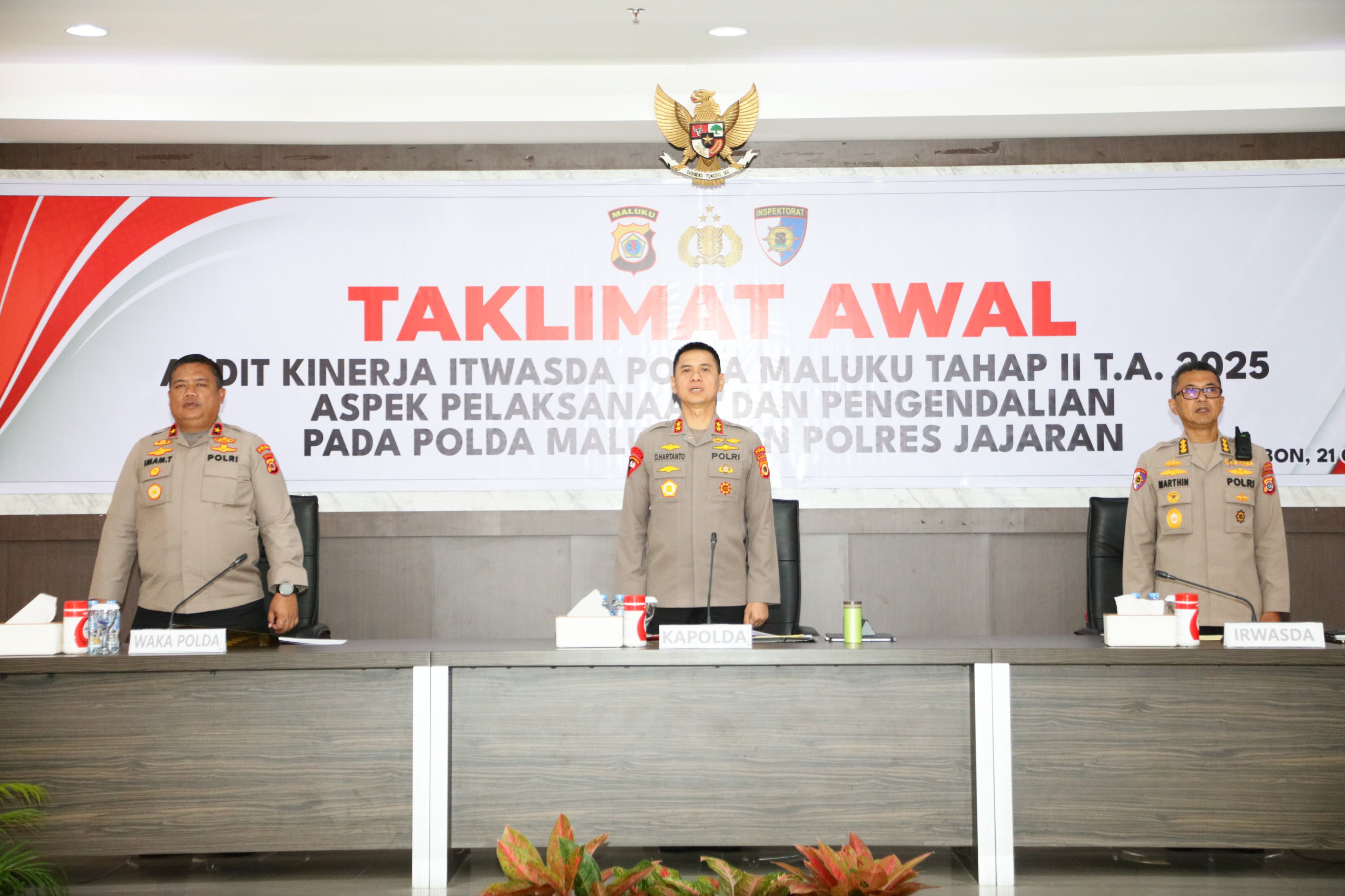 AMBON (info-ambon.com)-Kepala Kepolisian Daerah Maluku, Irjen Pol Prof. Dr. Dadang Hartanto, S.H., S.I.K., M.Si., secara resmi membuka kegiatan Taklimat Awal Audit Kinerja Tahap II Tahun Anggaran 2025 Bidang Aspek Pelaksanaan dan Pengendalian pada Polda Maluku dan Polres jajaran, Selasa (21/10/2025). Kegiatan berlangsung di Ruang Rapat Utama lantai V Mapolda Maluku, dan dihadiri oleh Wakapolda Maluku Brigjen Pol Imam Tobroni, S.I.K., Irwasda Polda Maluku Kombes Pol Marthin Luther Hutagaol, S.I.K., seluruh pejabat utama Polda Maluku, serta tim audit kinerja Itwasda.