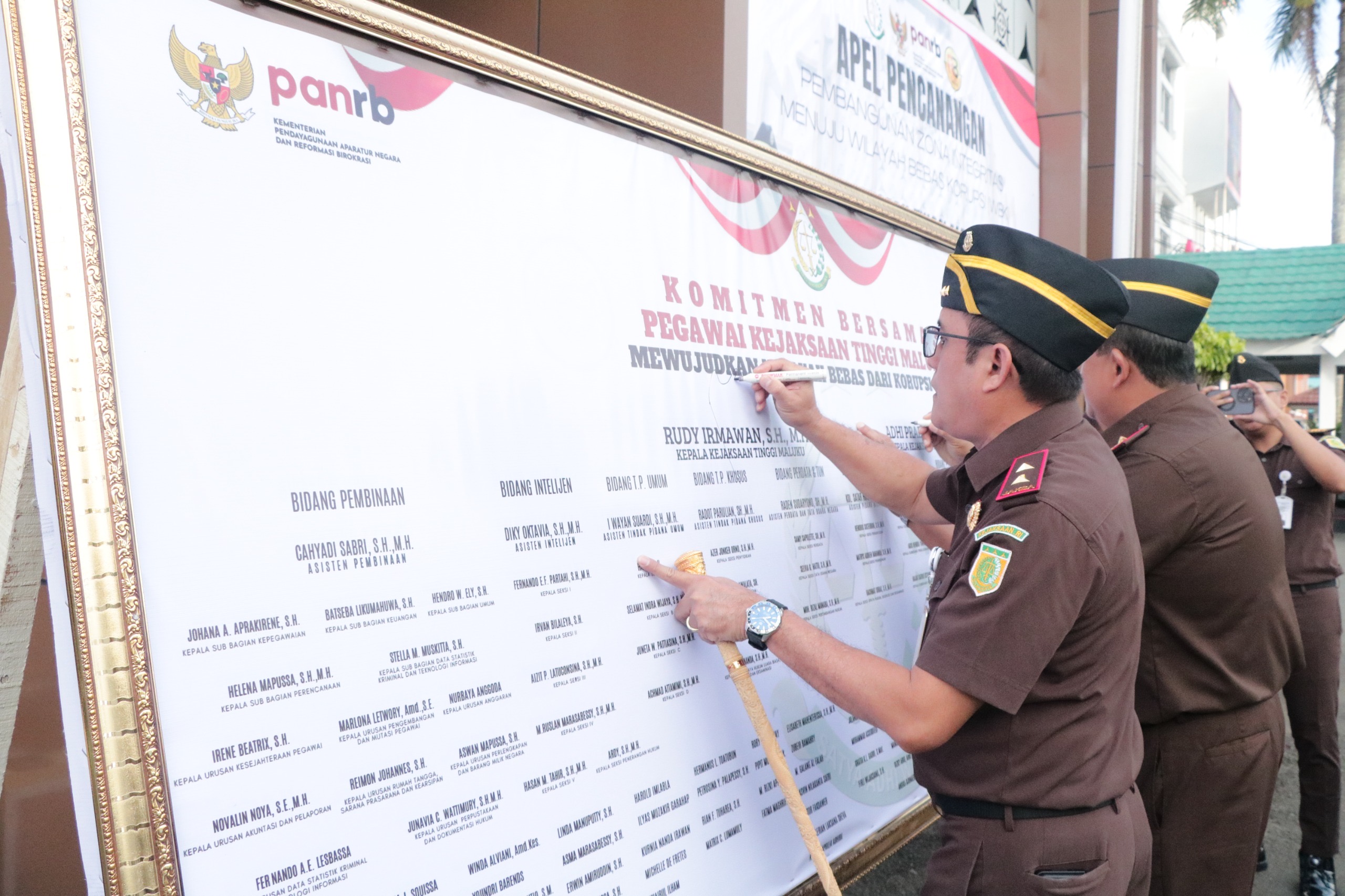 Usai apel, seluruh pegawai Kejati Maluku turut menandatangani komitmen bersama sebagai bentuk dukungan terhadap terwujudnya WBK dan WBBM di lingkungan institusi tersebut. (EVA)