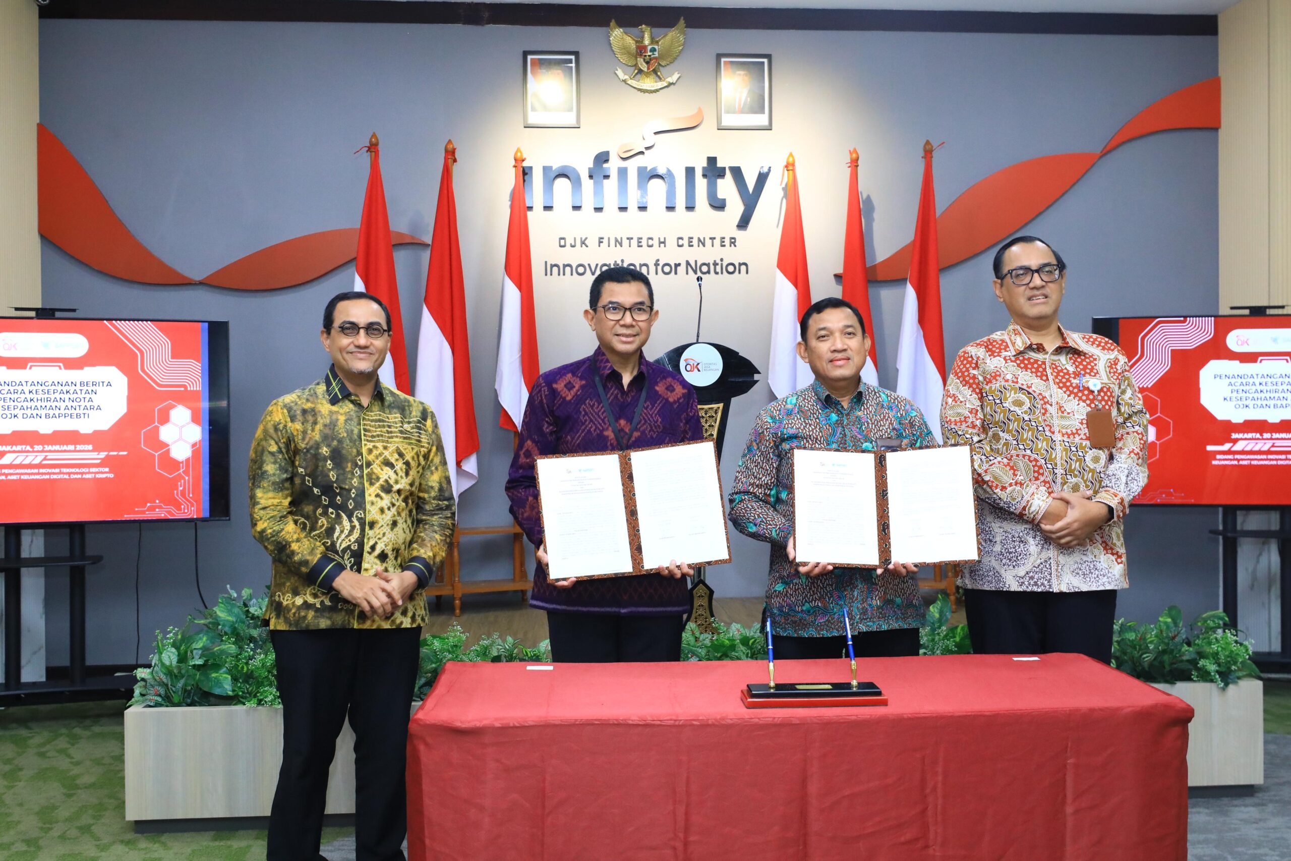 Penandatanganan tersebut disaksikan oleh Kepala Eksekutif Pengawas Inovasi Teknologi Sektor Keuangan, Aset Keuangan Digital, dan Aset Kripto OJK Hasan Fawzi serta Kepala Bappebti Tirta Karma Senjaya.