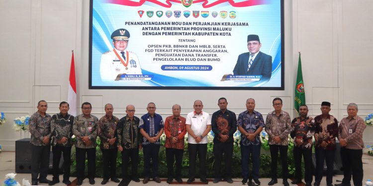 AMBON (info-ambon.com)-Pelaksana Harian Sekretaris Daerah Maluku Syuryadi Sabirin menandatangani MOU dan Perjanjian Kerja Sama Antara Pemerintah Provinsi Maluku dengan Pemerintah Kabupaten Kota, tentang Optimalisasi Pajak Daerah, pada Jumat (9/8/2024), berpusat di Aula Lantai 7 Kantor Gubernur Maluku.