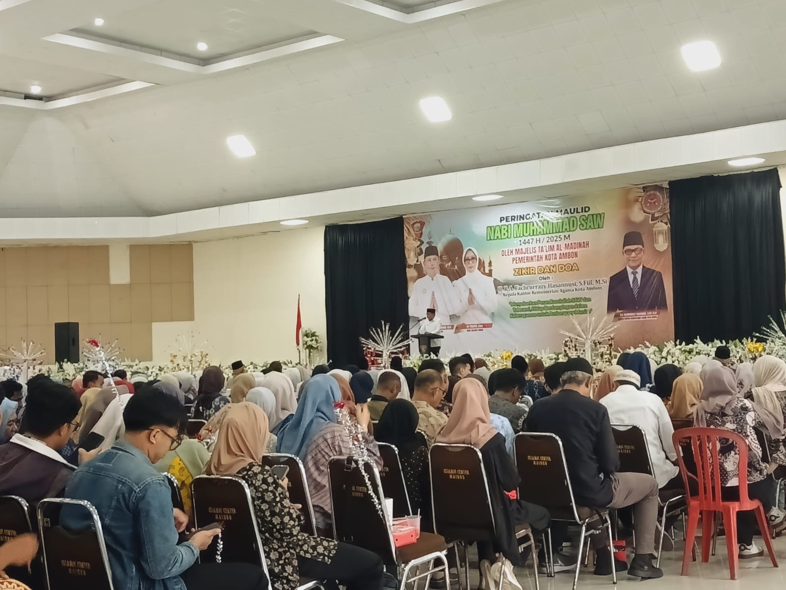 AMBON (info-ambon.com)-Majelis Taklim Al-Madinah Pemerintah Kota (Pemkot) Ambon, Kamis (2//10/2025) memperingati Maulid Nabi Muhammad SAW 1447 Hijriah tahun 2025 Masehi, dengan tema peringatan Maulid tahun ini adalah “Menyebarkan Pesan Rasulullah SAW dan Toleransi Hidup Berdampingan dalam Keberagaman untuk Ambon yang Manis”. yang dilaksanakan di Gedung Islamic Center.
