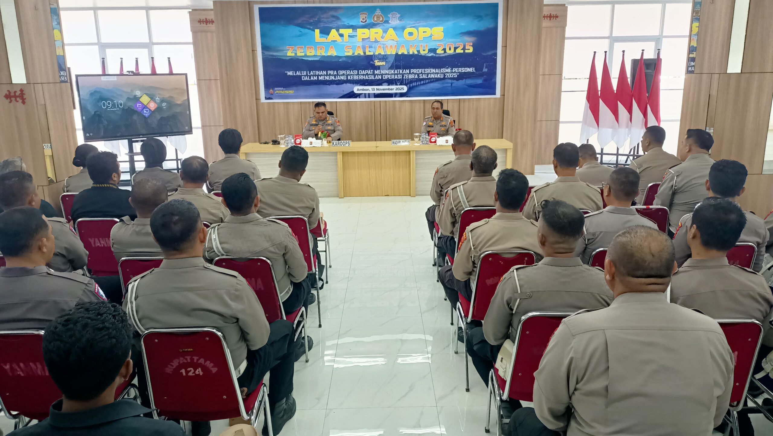 AMBON (info-ambon.com)- Direktorat Lalu Lintas (Ditlantas) Polda Maluku menggelar Latihan Pra Operasi (Latpraops) Zebra Salawaku 2025, Kamis (13/11/2025), di Aula RTMC Ditlantas Polda Maluku. Kegiatan ini menjadi langkah penting dalam memantapkan kesiapan personel menghadapi Operasi Zebra Salawaku 2025, yang difokuskan pada peningkatan disiplin dan keselamatan berlalu lintas di wilayah Maluku, khususnya di Kota Ambon.