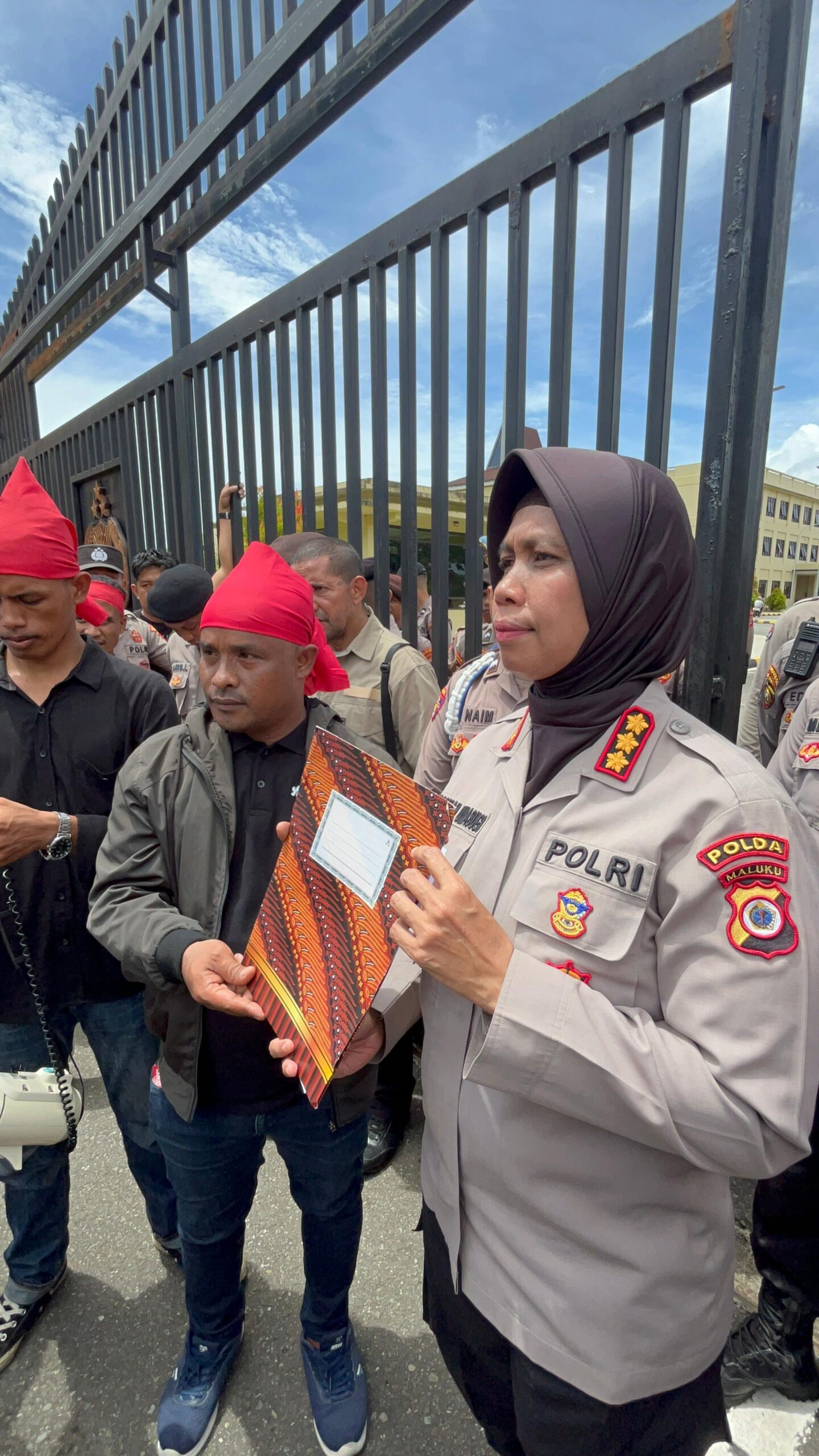Aksi Unras yang berlangsung damai dan tertib tersebut diterima oleh Kabid Humas Polda Maluku, Kombes Pol Rositah Umasugi S.IK di depan pintu gerbang utama Mapolda Maluku.