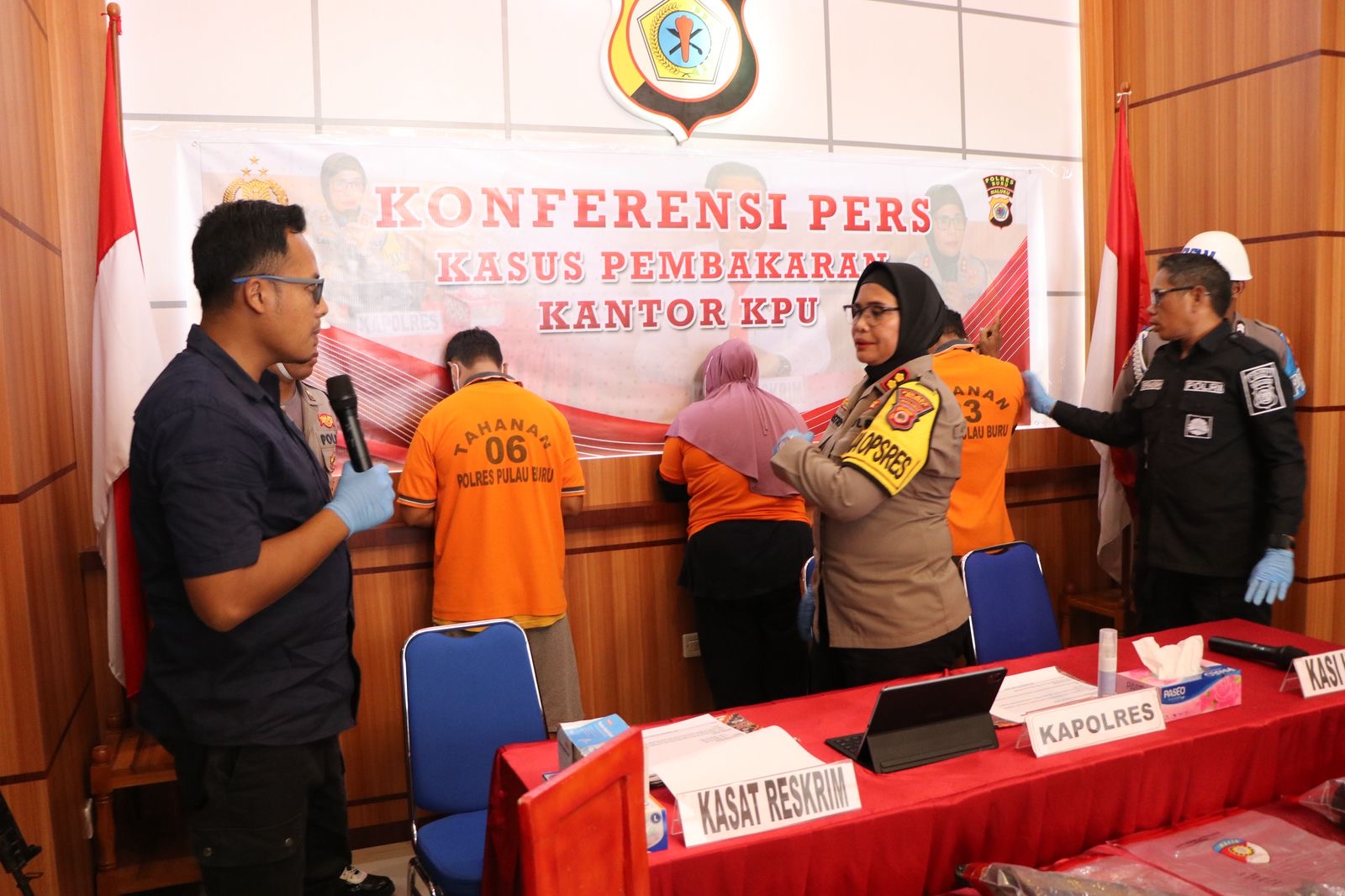 AMBON (info-ambon.com)-Jajaran Polres Buru, dibawa pimpikan Kapolres, AKBP. Sulastri Sukidjang, SH, S.I.K, MM, berhasil mengungkap dalang dan pelaku pembakaran kantor KPU Buru, pada tanggal 28 Februari 2025 lalu, yakni; bendahara KPU inisial RH (48), mantan Komisioner PPK Fenaleisela inisial SB (45), dan AT (42)