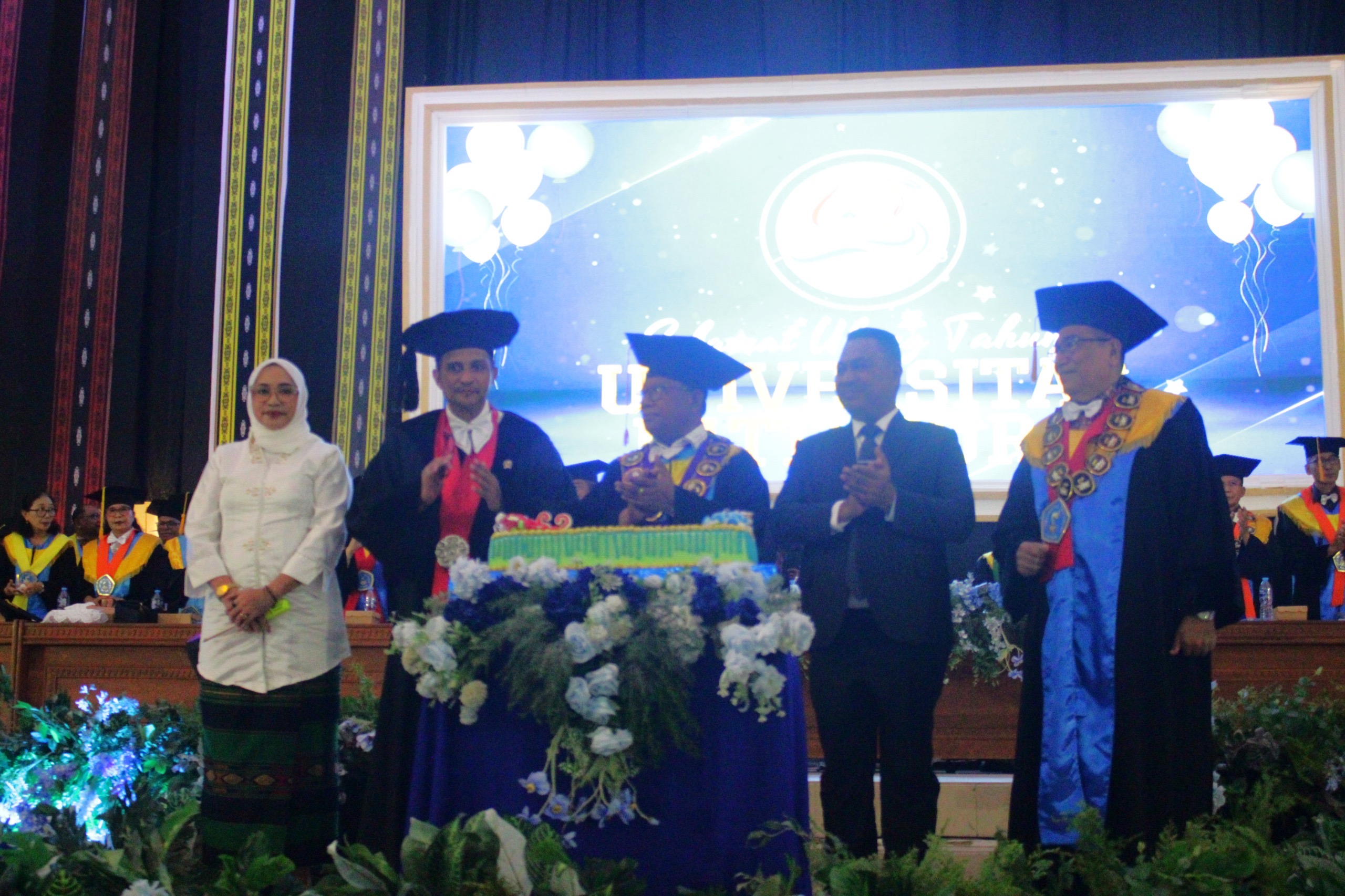 Acara Dies Natalis dan Wisuda ini juga dihadiri sejumlah pejabat nasional dan daerah, termasuk Wakil Menteri Hukum dan HAM RI, Prof. Dr. Edward Omar Sharif Hiariej. Dalam orasi ilmiahnya, Hiariej menekankan pentingnya peran mahasiswa sebagai agen perubahan.