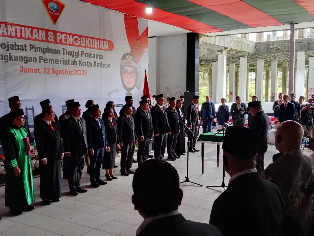 AMBON (info-ambon.com)-Wali Kota Ambon, Bodewin Wattimena, secara resmi melantik dan mengukuhkan sejumlah pejabat pimpinan tinggi Pratama di lingkungan Pemerintah Kota (Pemkot) Ambon, Jumat (22/8/2025). Prosesi pelantikan berlangsung di Gedung Terminal Transit, Kecamatan Baguala, Kota Ambon.